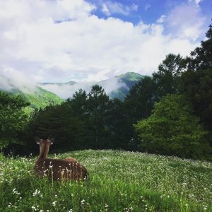 【農作業の合間、土出に寝そべる野生の鹿】