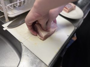 次に筋膜は何かというと。皮下組織から存在する白く薄い膜であり、英語のFasciaを筋膜と訳しているため誤解されがちですが、筋肉だけを包む膜ではなく、骨、内臓器官、血管、神経など身体のあらゆる構成要素を包みこみ、それぞれの場所に適正に位置するよう支えているものです。これを緩めることにより血流改善、痛みの原因である筋肉を緩めることができます。今回使う肉は豚バラなので皮は向いてありますが筋膜を触ることは可能でした。