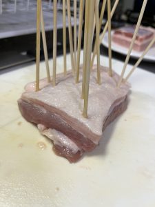 次に鍼の代わりに普段使っている鍼より太いですが竹串を使いさしていきます。この時につかったツボはどこの豚バラなのかわからなかったので阿是穴(あぜけつ)という反応点に打っていきました。少し筋肉が張っていたので少し多めにやりました。