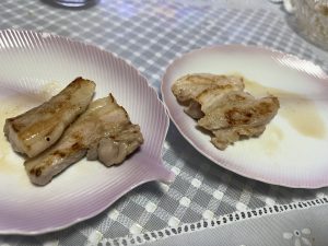 そして一番大事な味を確かめるためにめちゃくちゃ癒された豚バラとなにもしていない豚バラを焼いて食べ比べてみました。(味付けは塩コショウのみです。)