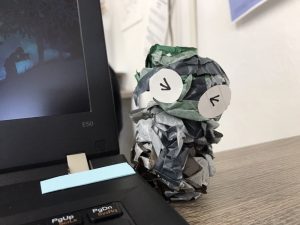 そんなある朝出勤すると、パソコンの上にちょこんと座っていたのは、使用済みマスキングテープで出来た「ごみたろう」。いたずら好きな看護師Nさんの仕業です。パソコンの隣りが定位置になり、ふと目をやると「おいおい、大丈夫かよ〜頑張れよ〜」と聞こえてきそうです。なんだか憎めないこの感じについ癒されてしまいます。