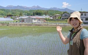訪問中、田植えが終わったばかり、水鏡に移る八ヶ岳を見つけて、