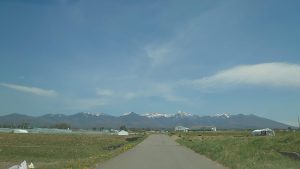 田おこしがはじまったばかりの、土が点々と落ちている農道。満開のたんぽぽ。残雪の峰々。